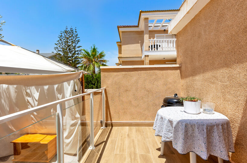 Ubicada a aproximadamente 1.5 km del mar, esta propiedad permite un acceso rápido a las impresionantes playas de La Zenia, conocidas por sus aguas cristalinas y arenas doradas. La zona ofrece una amplia gama de servicios y comodidades, incluyendo supermercados, restaurantes, centros comerciales como el popular Zenia Boulevard, y diversas opciones de ocio. Aunque el complejo no dispone de piscina comunitaria, su excelente ubicación y conexiones de transporte facilitan el acceso a otras áreas de interés en la Costa Blanca, convirtiéndola en una opción ideal tanto para residencia permanente como para inversión vacacional.