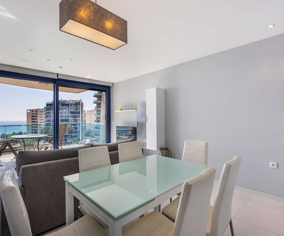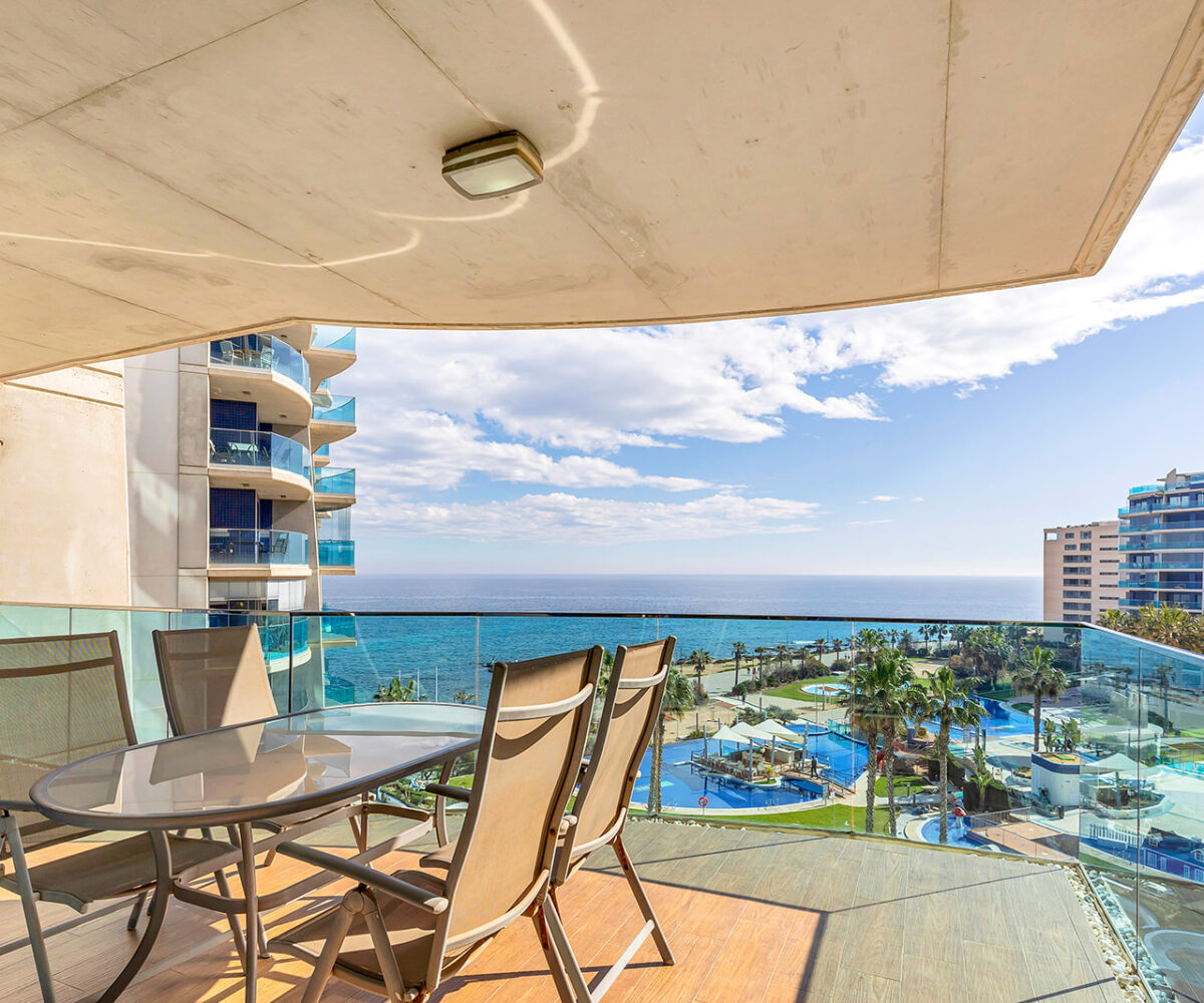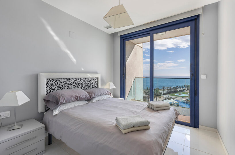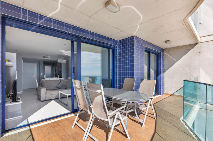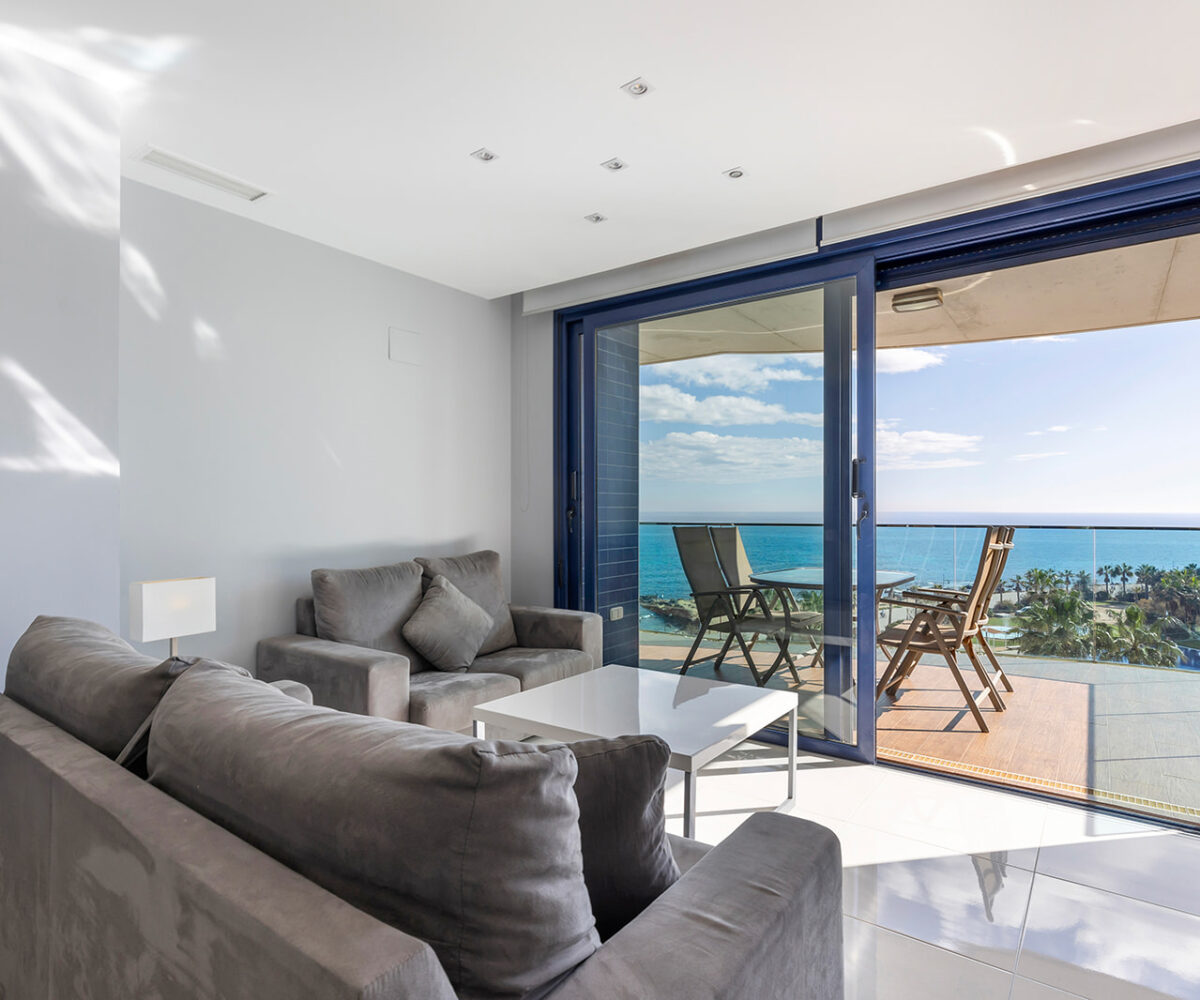 Además, cuenta con una terraza de 16 m², orientada al este, ideal para disfrutar de amaneceres y vistas panorámicas al Mar Mediterráneo. El apartamento se encuentra en la quinta planta y se entrega totalmente amueblado, listo para entrar a vivir.