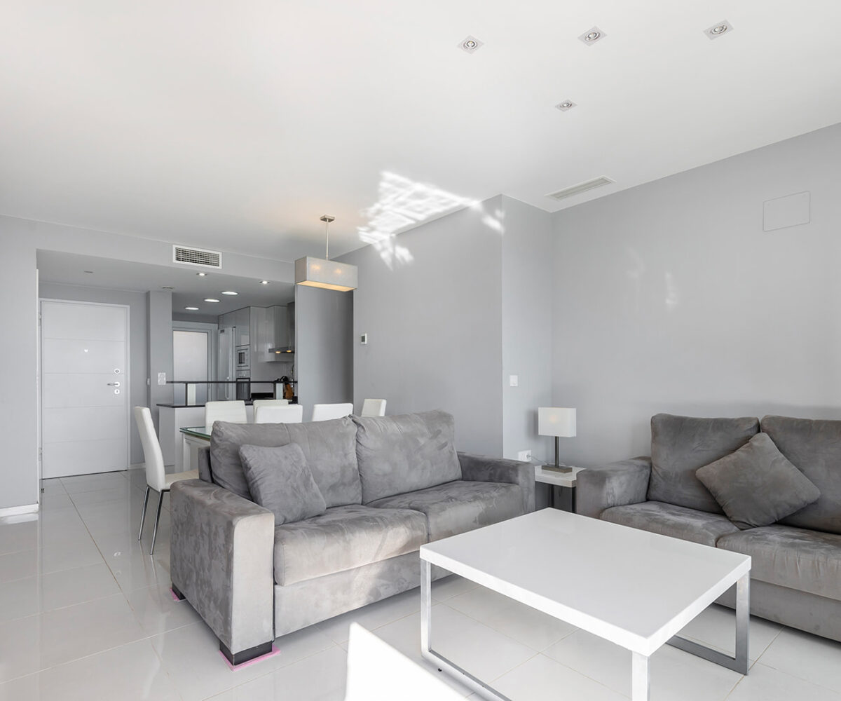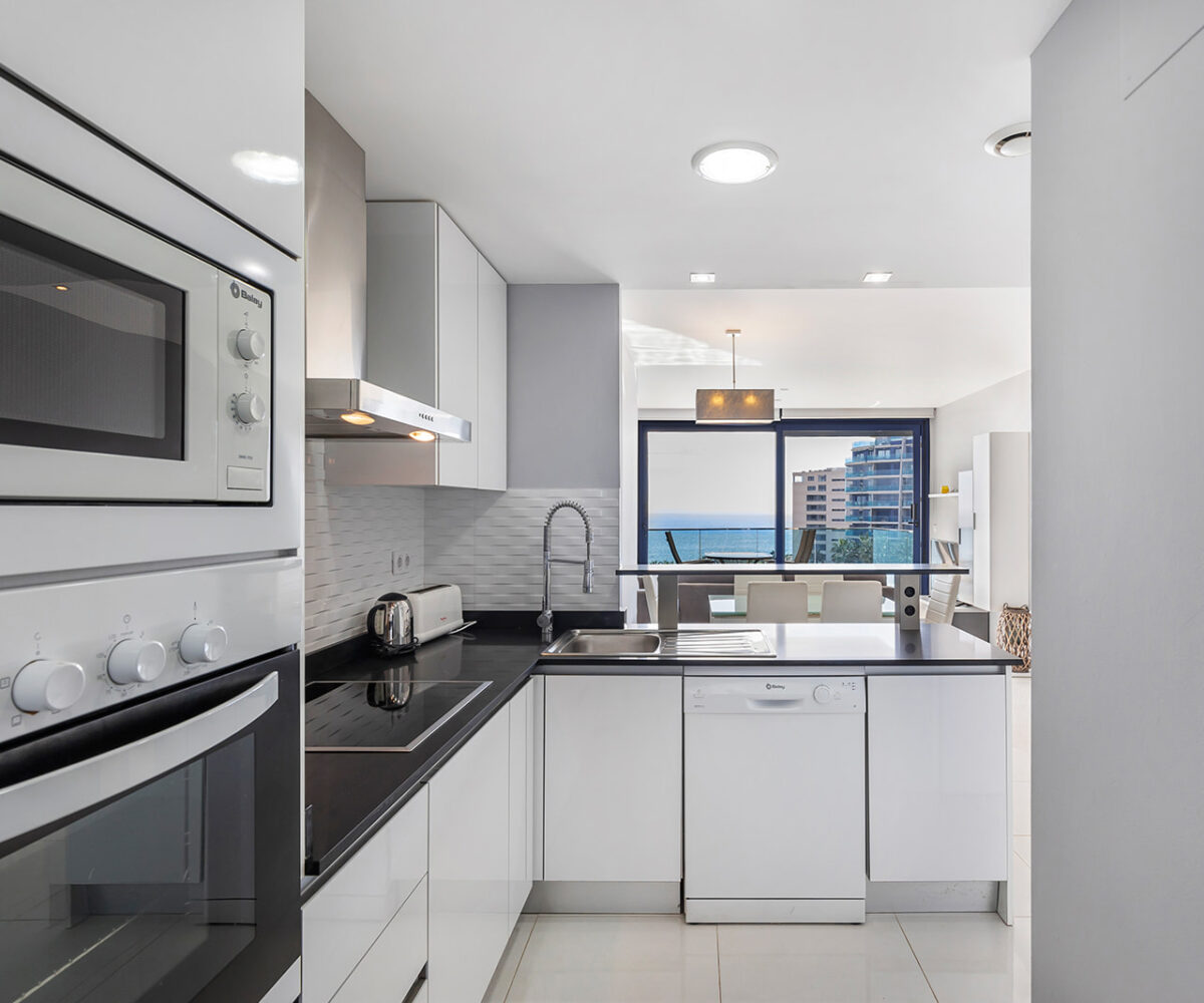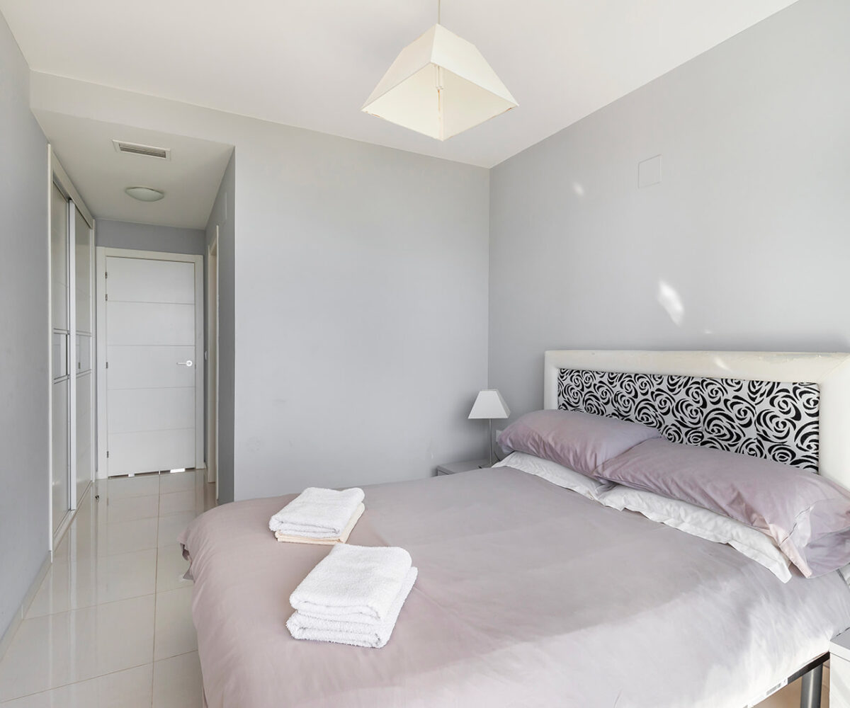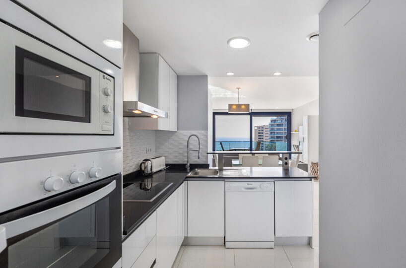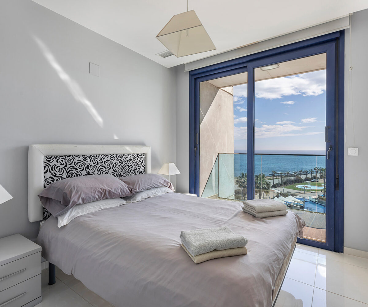 Además, cuenta con una terraza de 16 m², orientada al este, ideal para disfrutar de amaneceres y vistas panorámicas al Mar Mediterráneo. El apartamento se encuentra en la quinta planta y se entrega totalmente amueblado, listo para entrar a vivir.