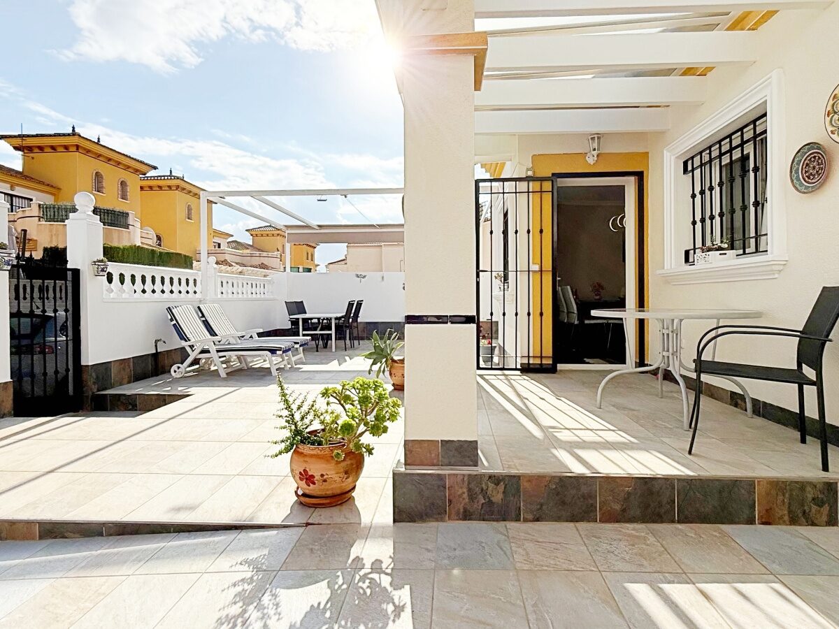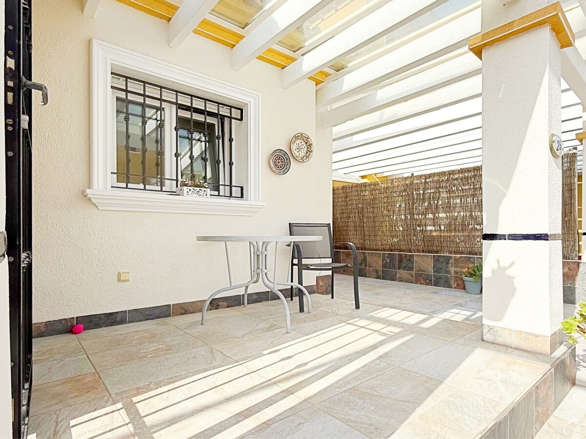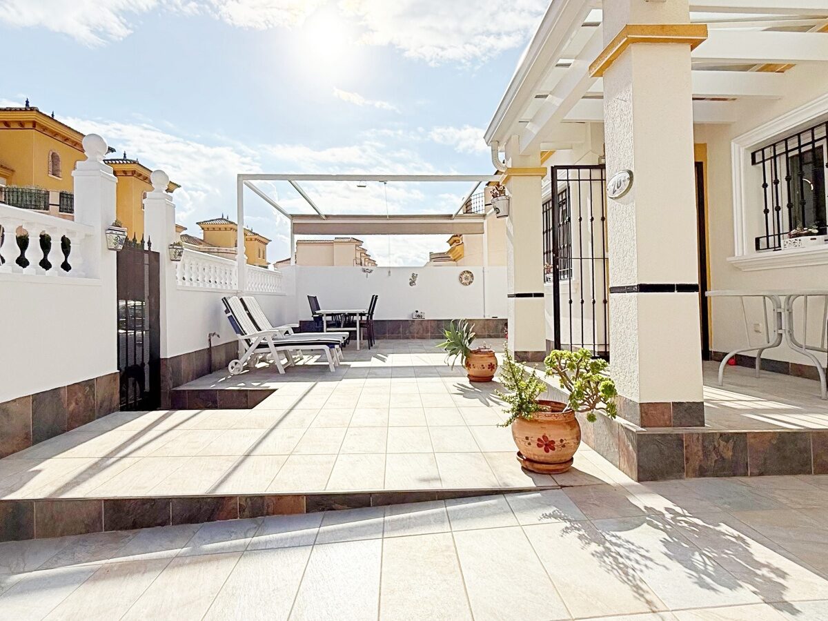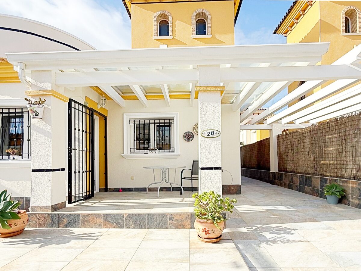 Outside, the villa offers a private plot with parking area and storage room, providing extra convenience and space. The gated community features landscaped common areas and a communal pool, perfect for enjoying the Mediterranean climate.