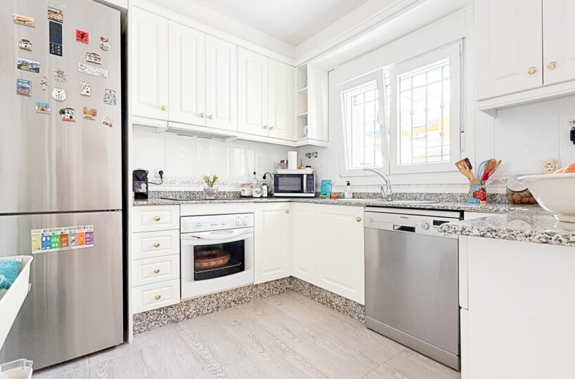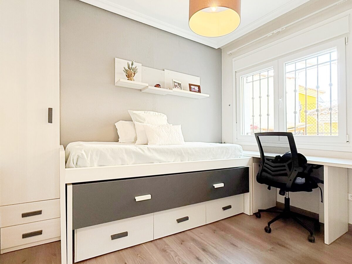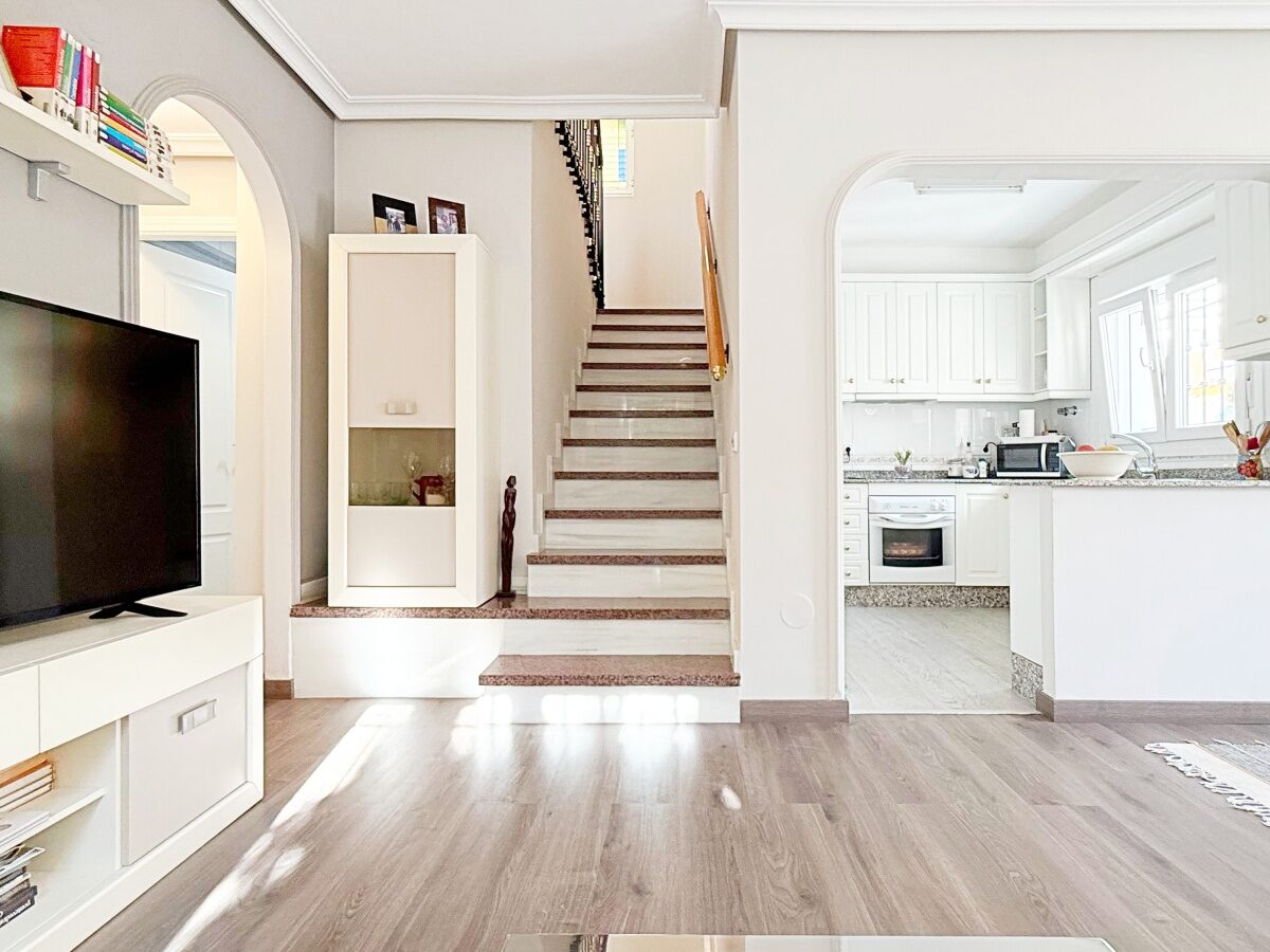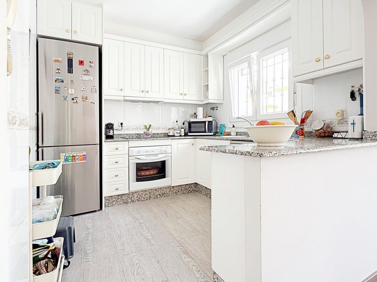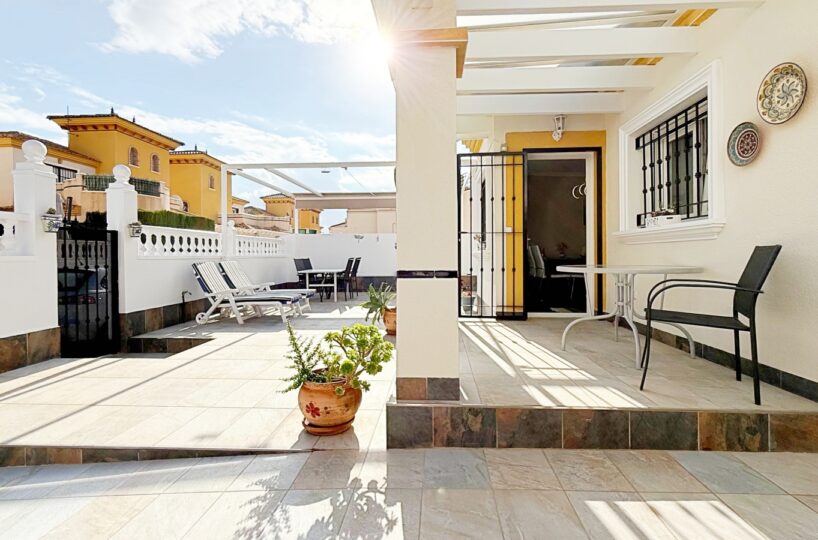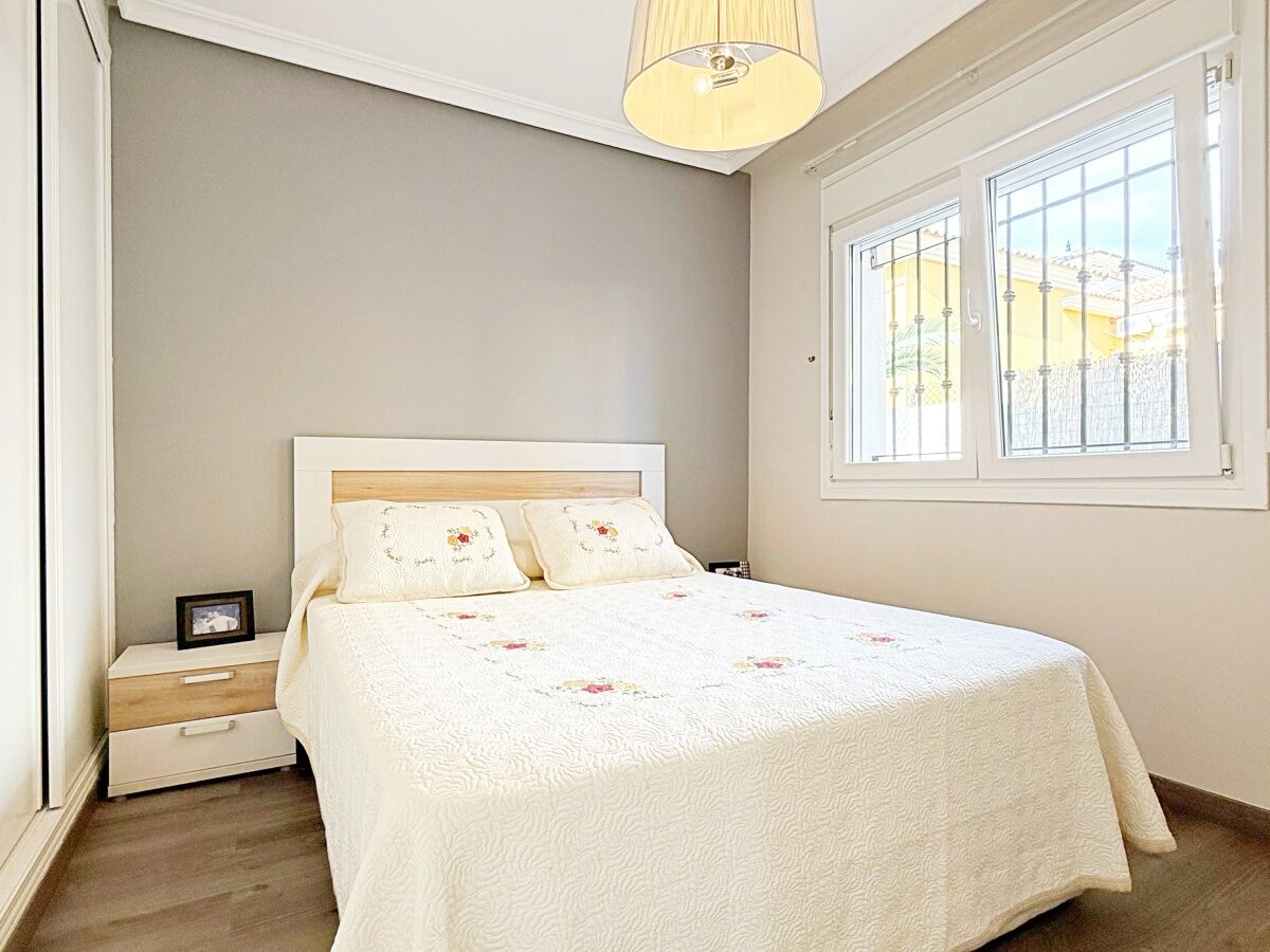 Outside, the villa offers a private plot with parking area and storage room, providing extra convenience and space. The gated community features landscaped common areas and a communal pool, perfect for enjoying the Mediterranean climate.