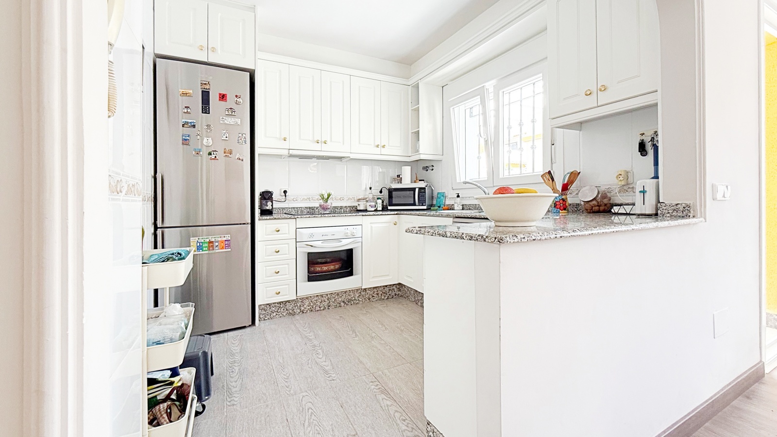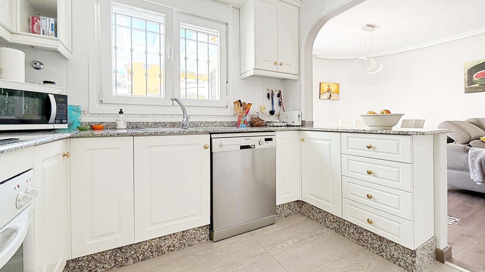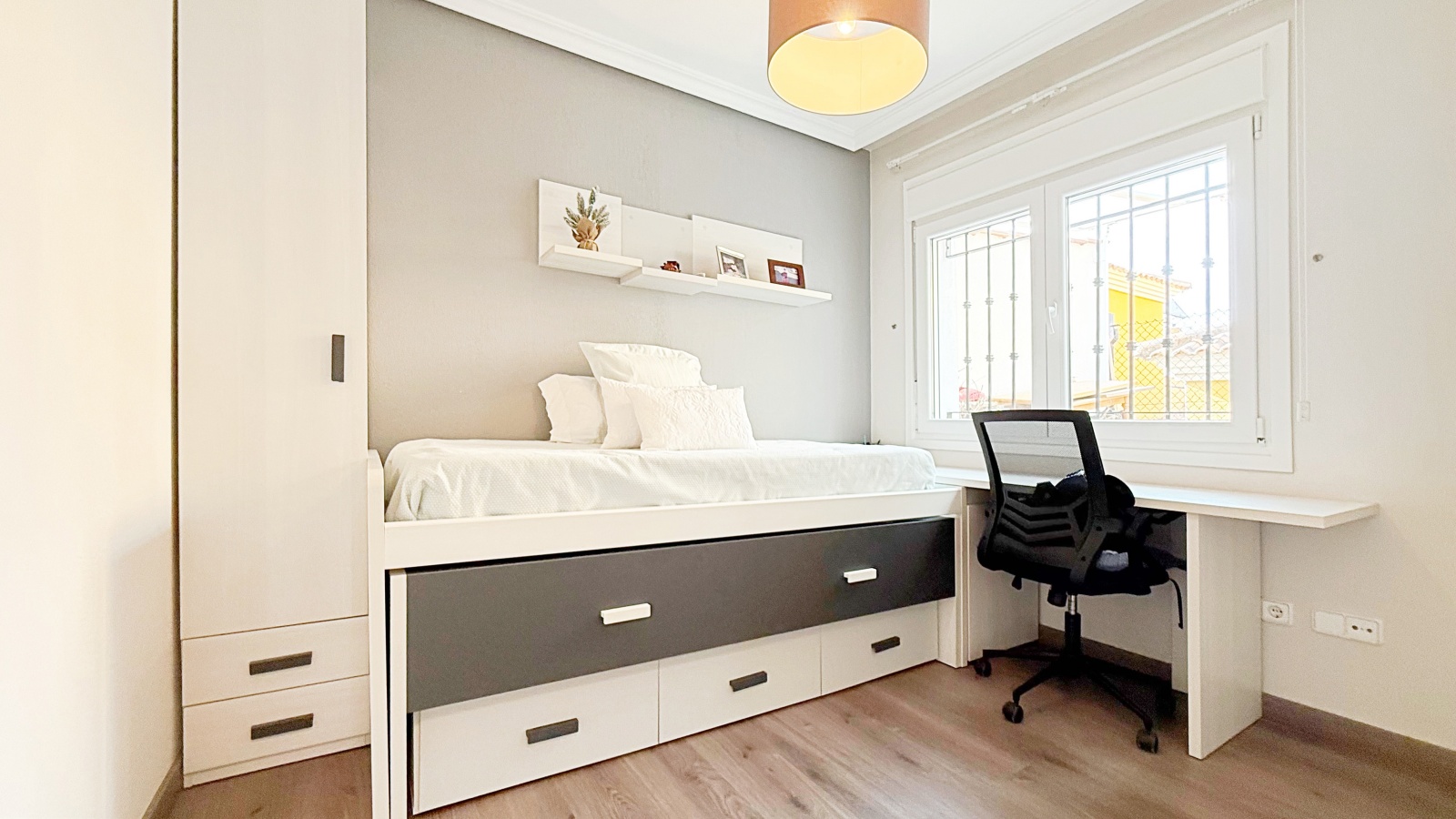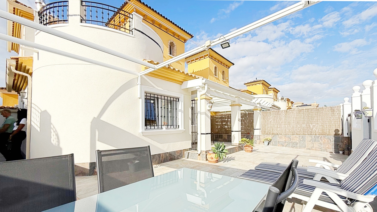 Outside, the villa offers a private plot with parking area and storage room, providing extra convenience and space. The gated community features landscaped common areas and a communal pool, perfect for enjoying the Mediterranean climate.