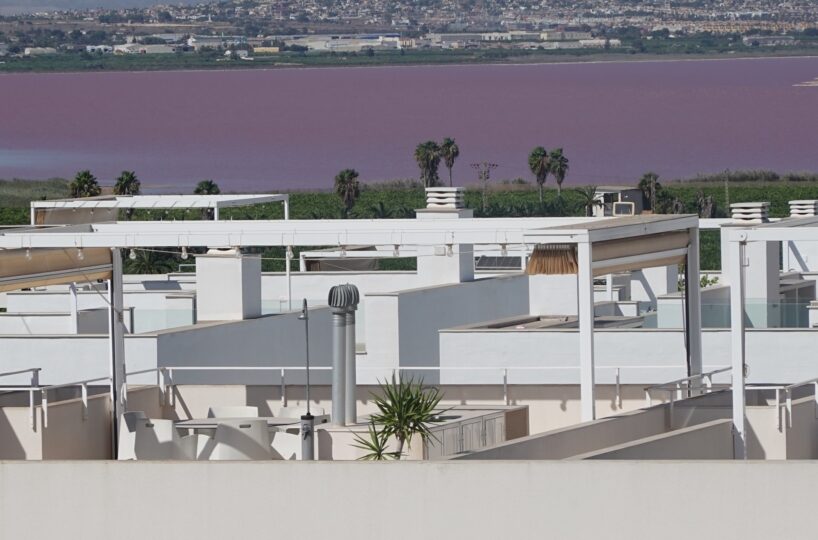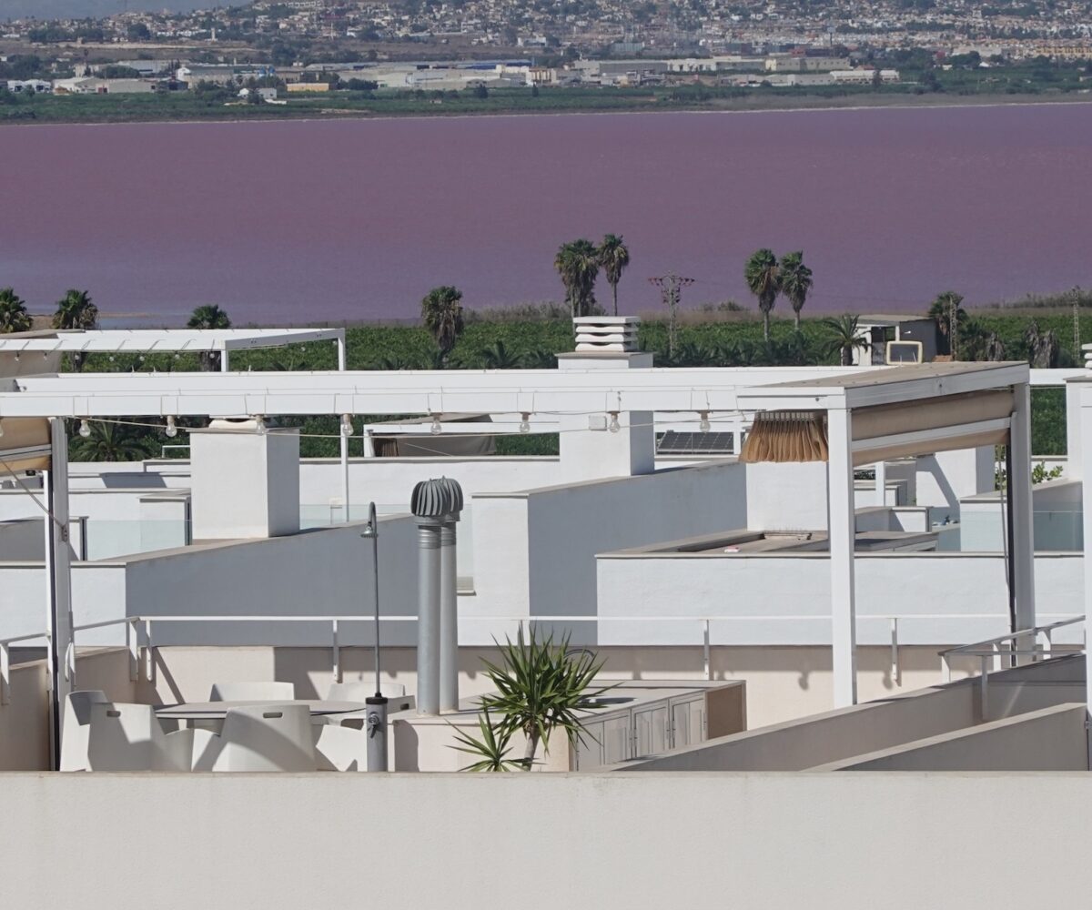Главная особенность объекта — впечатляющий частный солярий площадью 75 м2, полностью оборудованный для круглогодичного отдыха. Здесь есть зоны для релаксации, открытая обеденная зона, барная стойка и перголы — идеальное место для спокойного отдыха или приёма гостей. С солярия открываются потрясающие виды на Розовое озеро и весь город Торревьеха.